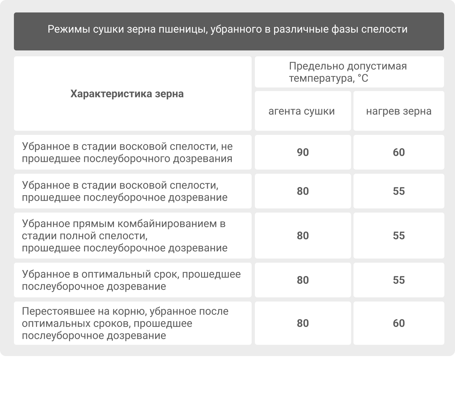 В таблице представлены температурные особенности сушки для зёрен пшеницы разных фаз спелости.