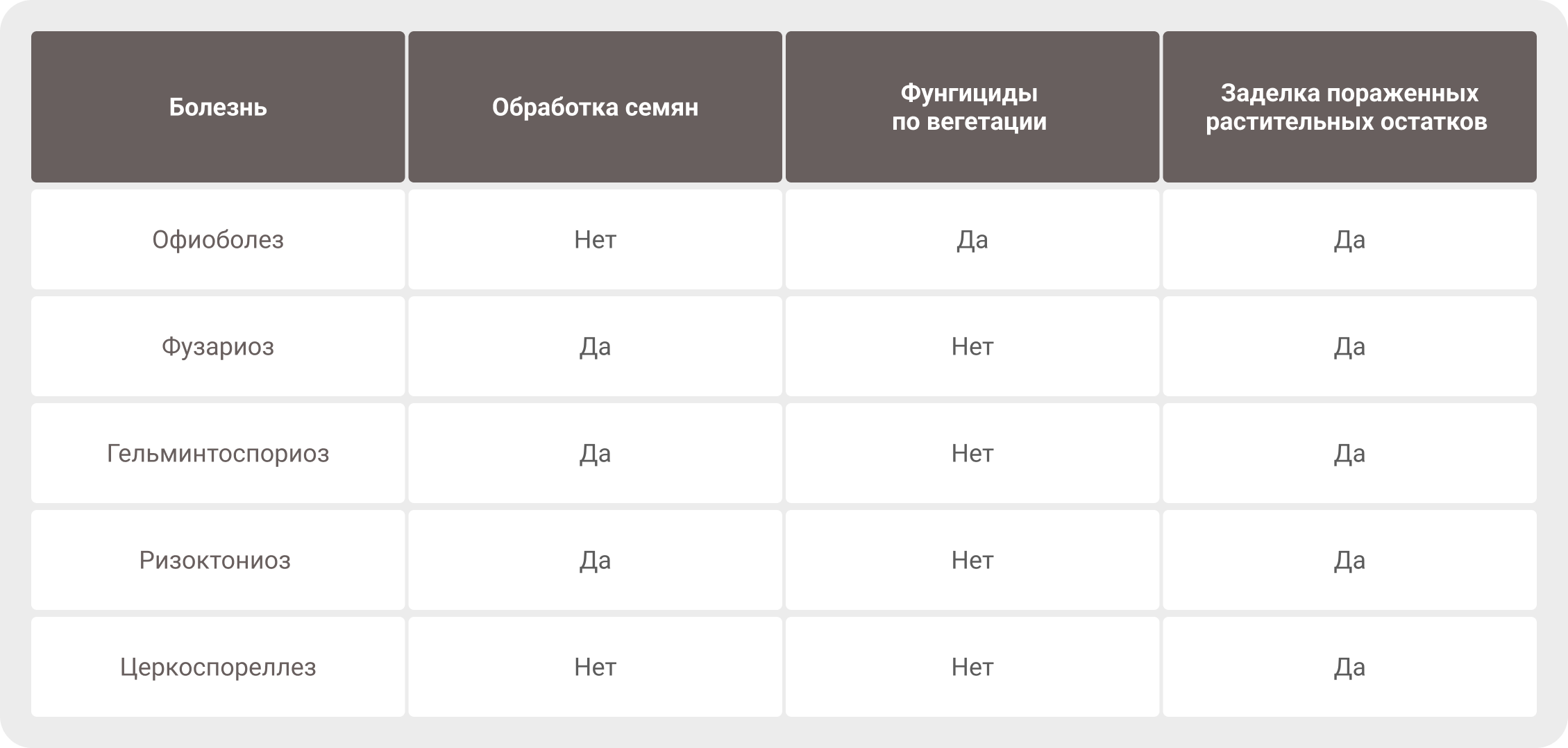Офиоболез не контролируется с помощью обработки семян, как и церкоспореллез. Церкоспореллез – это прикорневая гниль, поэтому обработка семян никак не влияет на развитие патогена.