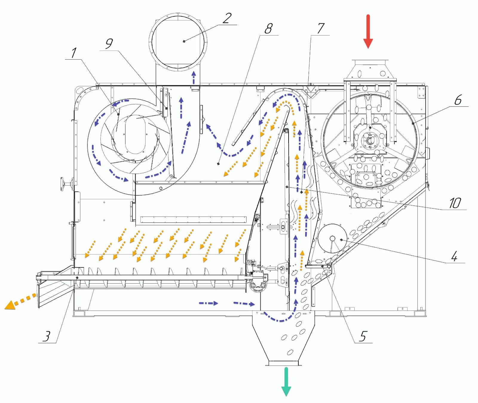 Неочищенный ворох поступает в приёмный патрубок. Зерно проходит через барабан просеивания, решёта которого несколько больше очищаемого зерна. Оно просыпается свободно вниз, а камни, палки, трава и прочие мёртвые отходы по барабану идут дальше и выходят в выгрузной патрубок. После зерно поступает в камеру, в которой потоком воздуха выдуваются пыль и мелкие частицы зерна. Уже очищенное зерно ссыпается по патрубкам в бункер, а пыль и мелкие частицы отделяются в камере лёгких примесей. Мелкие примеси собираются в отдельный бункер, а очищенный воздух выходит на улицу. |