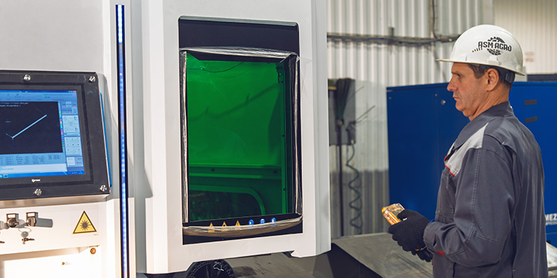 Для резки профильных труб в ASM-AGRO используют высокоточное оборудование. На фото рабочий задаёт программу резки труб для модулей норийной вышки. Современные лазерные резки сводят брак к минимуму и позволяют разрезать трубы на точное расстояние.